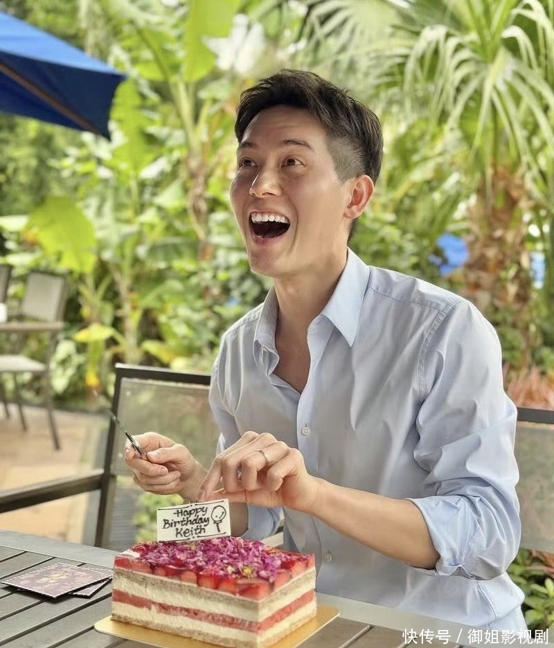 穿着浅色衬衫的他看起来也是帅气依旧,身形完全没有发福的迹象。盛劲为面前的桌子上摆着一个方形的小蛋糕,上面一层铺满了草莓,看起来就十分美味,相信盛劲为也是早就开始流口水,迫不及待的要切蛋糕。